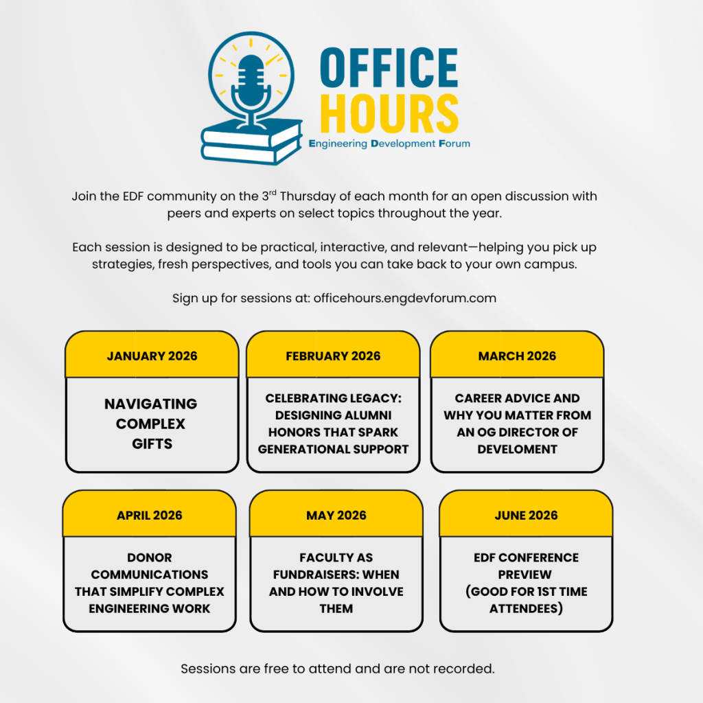 Join engineering development professionals from across the country to learn, share, and experience cutting-edge approaches and innovations in fundraising, alumni relations, and communications for schools and colleges of engineering